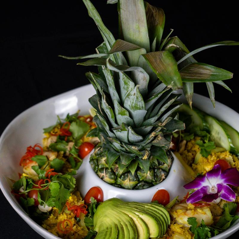Pineapples fried rice with chicken and shrimp, avocado, and cashew curry powder.